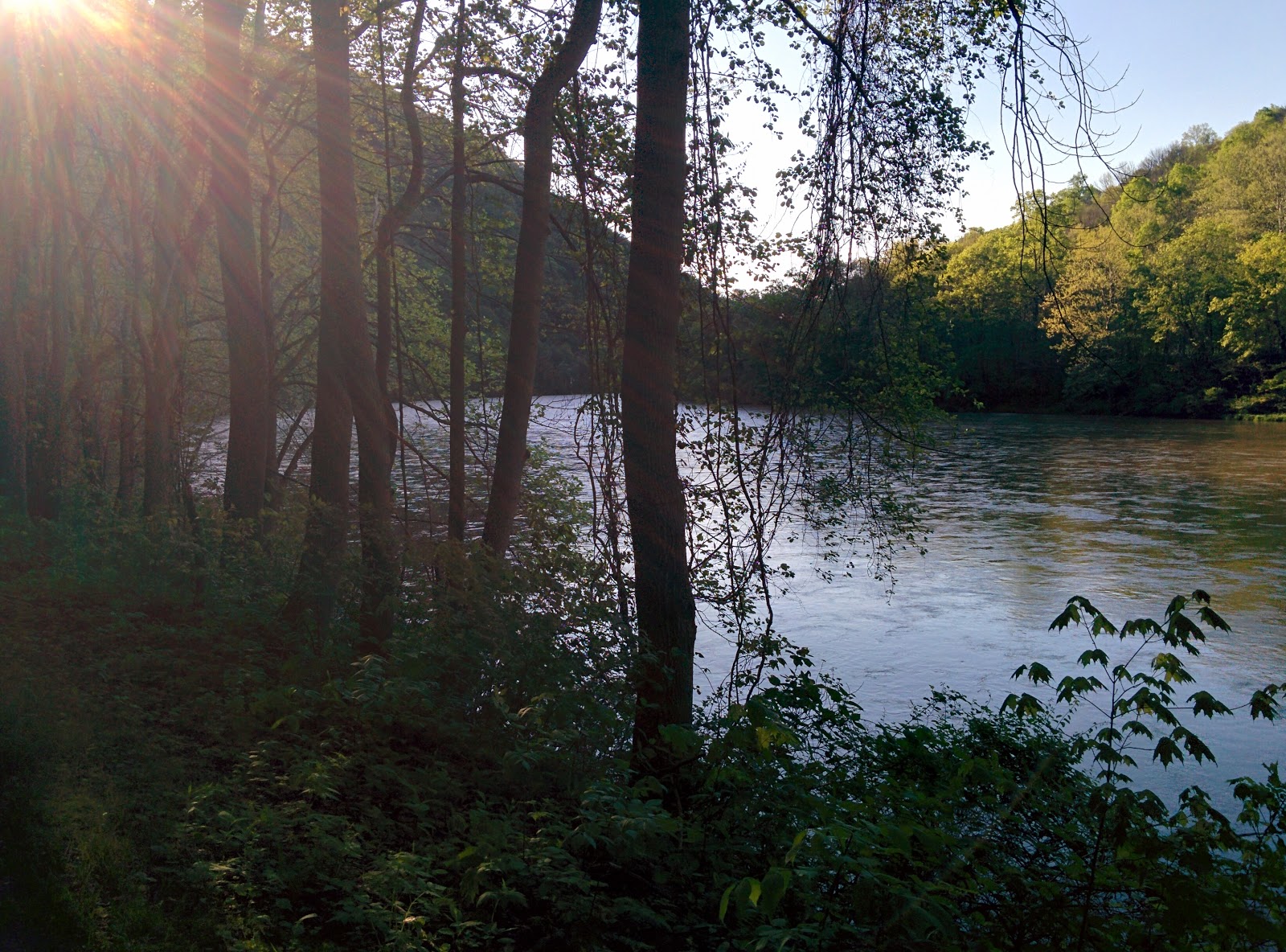 Aside from that, the day went fairly well, all in all. I've had an unknown shoulder injury for months that has concerned me, but while it certainly bothered me during the ride, it was by no means intolerable, and it seemed to peak out after a number of miles before fading into the background. Other aches and pains came back like old friends, and my shoulder just seemed like a new friend for the rest of them. The trail was lovely, forested, river on one side, often steep rock and little waterfalls on the other, passing through many nice little towns, not to mention, blissfully flat. I realized how much work there must be in maintaining the trail, despite it being crushed limestone after the first 20 miles of pavement, due largely to all the trees. I saw several that looked prime to fall, one being cleaned up, and one that had not yet been cleared and required going around the trail to pass.
